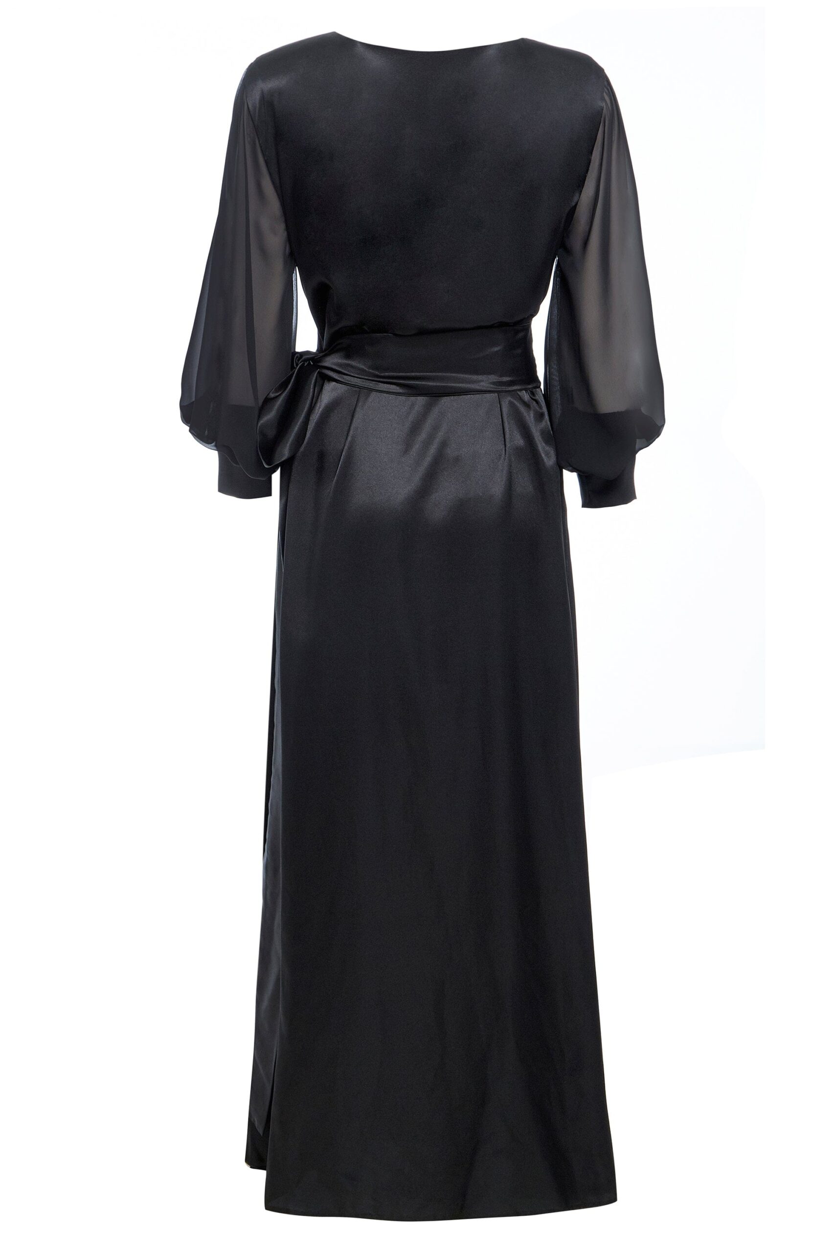 The Amber black wrap maxi dress channels the vampy boudoir glamour of 1940s silver screen sirens. Crafted in lustrous black satin, this wrap design features a plunging V-neckline, tie waist, and thigh-high side slit for a sultry yet elegant finish. Statement balloon bishop sleeves complete the silhouette, creating a timelessly feminine gown perfect for evening occasions and red-carpet glamour.