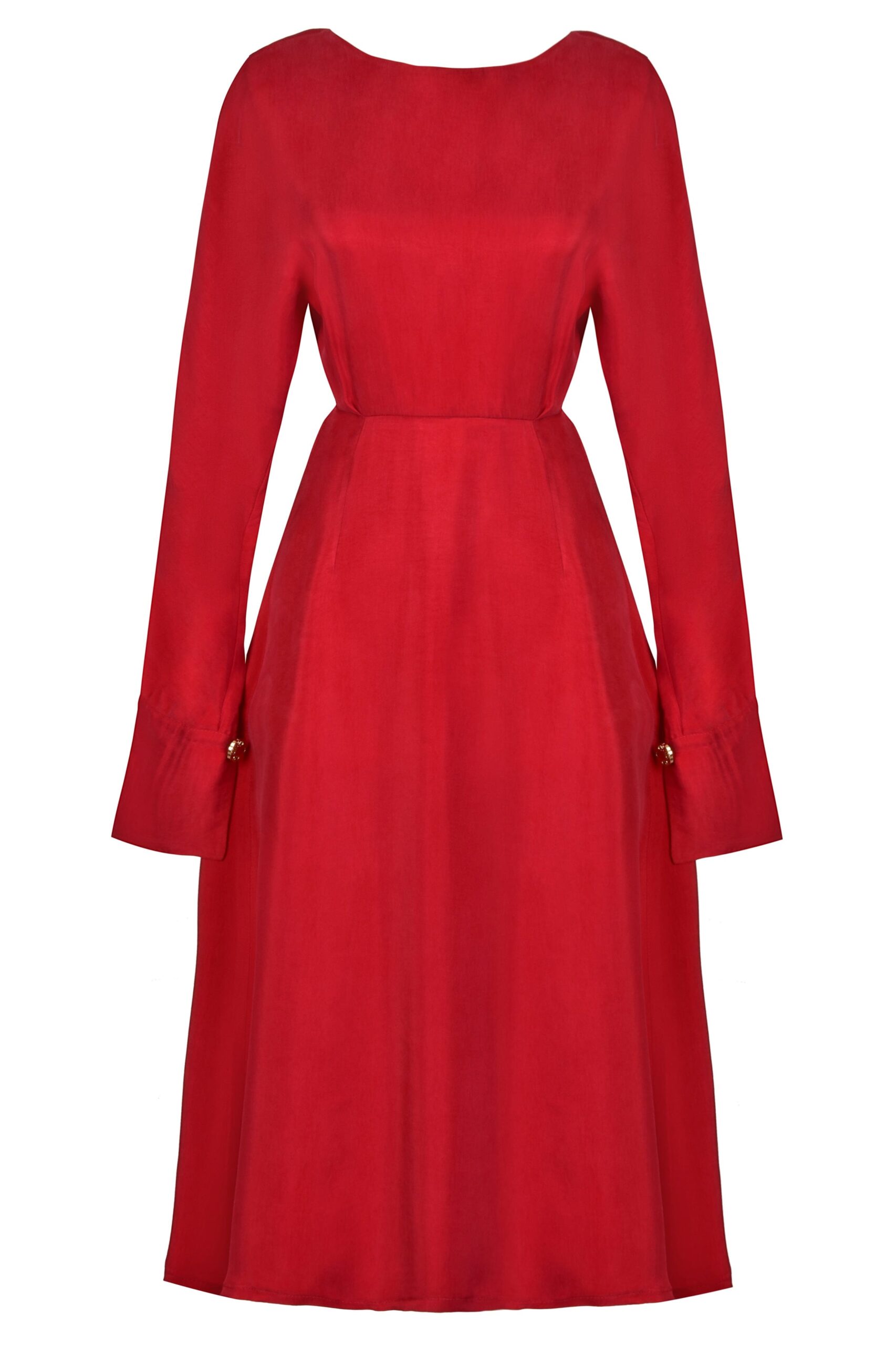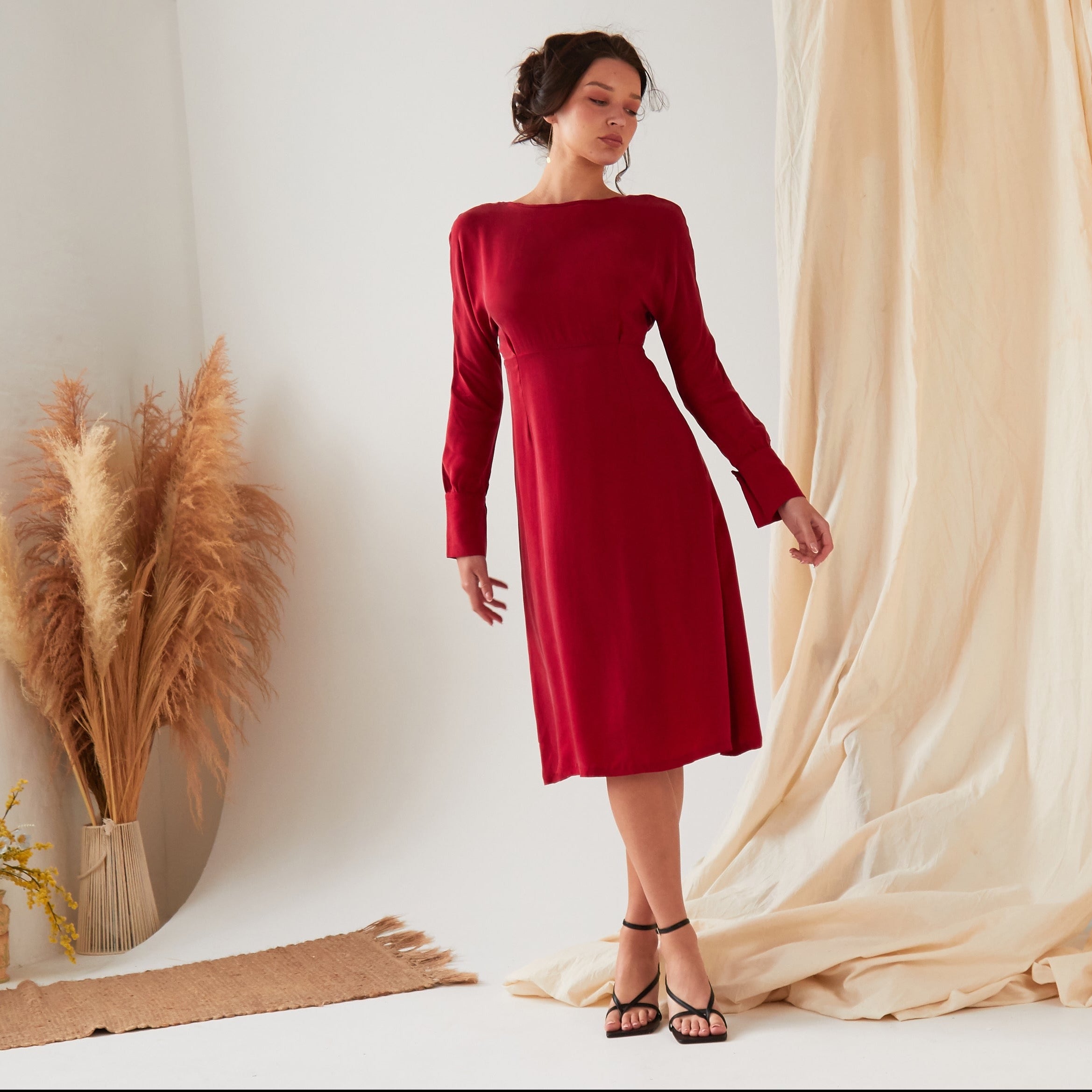 The Shay long-sleeve red midi dress is a versatile classic that takes you seamlessly from day to night, season to season. Crafted from an eco-friendly silk-like Cupro fabric, it combines luxury with sustainability for a timeless look. Designed with a cinched waist to flatter the figure, Shay offers a reversible style: wear it high-neck for understated elegance or deep V-neck for a bold statement. Also available in shimmering gold.